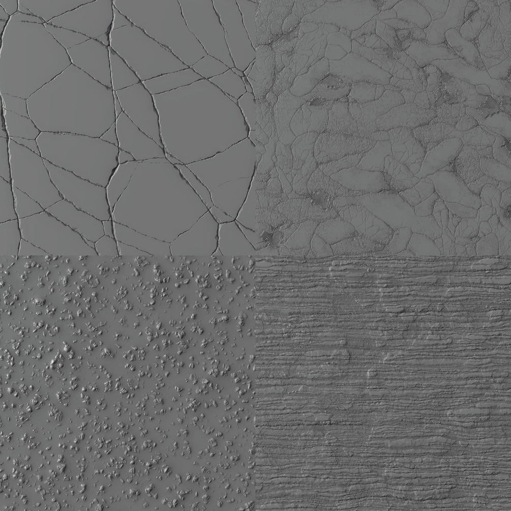 The node outputs a heightmap as well as several masks that can help you with coloring or blending in additional details.
